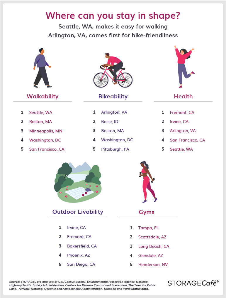 To find which cities offer an optimal mix of factors to help you reach your fitness goals, we started by looking at the 100 largest cities by population. We’ve analyzed cities based on several key indicators that foster an active lifestyle including venues for exercising, walkability, bike-friendliness, overall health, weather and natural conditions, including park space per capita, air quality index, days with precipitation, beach length and fitness club access and costs, as well as self storage costs – sports, biking and workout equipment is often kept in storage.