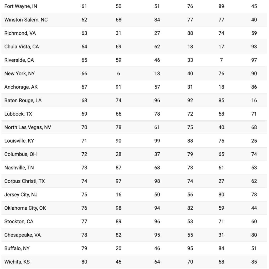 It’s true that rain and the cold can be a big turnoff when it comes to active lifestyles, as going out for a jog in Pittsburgh during the winter is a lot less achievable than in Miami, but sustainable urban infrastructure and indoor amenities can make up for weather-related drawbacks. In fact, Pittsburgh boasts the largest number of indoor fitness venues in the Northeast. Let’s see where residents are really supported by community amenities to stay active so you can plan your move towards a better living environment.